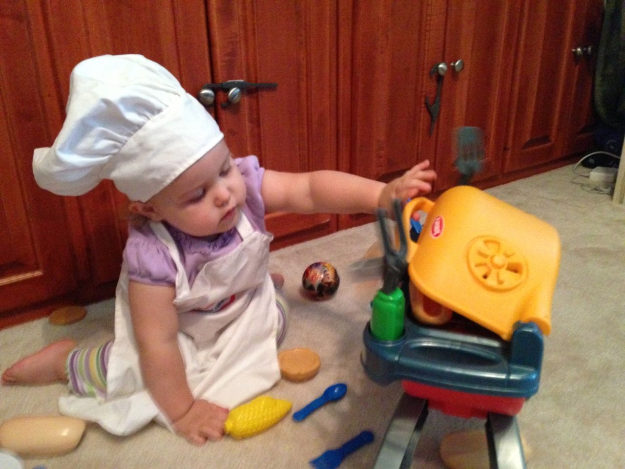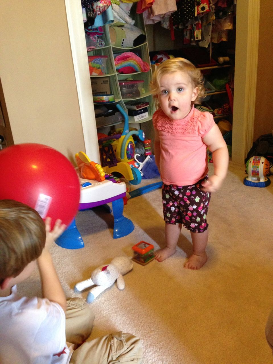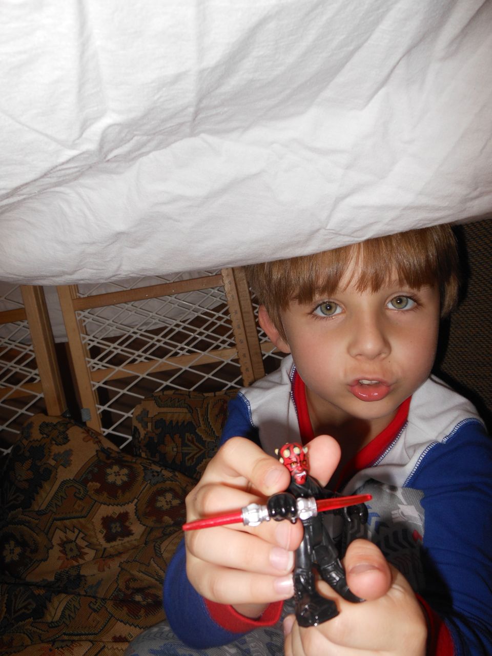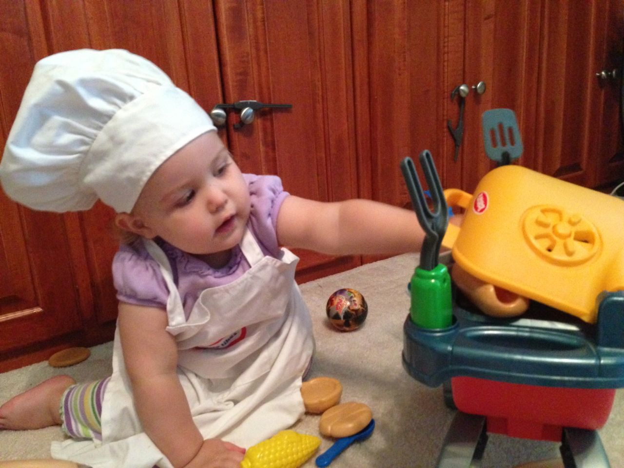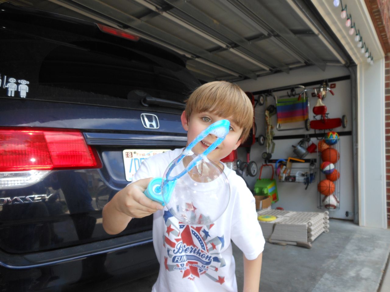 With the top floor’s air conditioning unit being broken for the past few days (why does this sort of thing always happen around a holiday?!) it finally became unbearable upstairs.. So, we had a family sleepover, together on the middle level. Brandon and I had the pull-out couch, Brian had the other couch, and Kendall (to her great displeasure) was in the pack’n’play. Not the most comfortable, but we made the most of it! The kids made all sorts of pillow forts and blanket tents, and that made it pretty fun. We brought down nightlights, one of which projects star shapes, and Brian’s Darth Vader flashlight. Kendall just loves taking off his helmet! We had fun playing a lot today, will the grill set, sidewalk chalk and bubbles, Lego Star Wars, stomp rocket, Star Wars figures, music toys… All over the map! We even brought out the Speak’n’Spell–a toy from TI that Brandon and I both had as kids, and really enjoyed. Brandon’s been working hard on the garage project, and check out that awesome wall system he’s got going now! Getting those items off the floor will help a lot. After Kendall’s nap, we decided to have our homemade popsicles (made from fruit, vanilla pudding, and orange juice) outside–they are tasty, but very messy! The kids got super sticky, and then super silly as the sugar took hold. Brian played with the stomp rocket as Kendall looked on–she got so excited every time Brian launched it! You can tell from her reaction, this was the height of entertainment! While working in the garage, Brandon found some unused “highly-available beverage helmets” that celebrated a Red Hat Cluster Suite release a few years ago. We tried to get Kendall to pose with one on, but she wasn’t exactly into the helmet look today. 😉 All in all, a super fun summer Sunday.