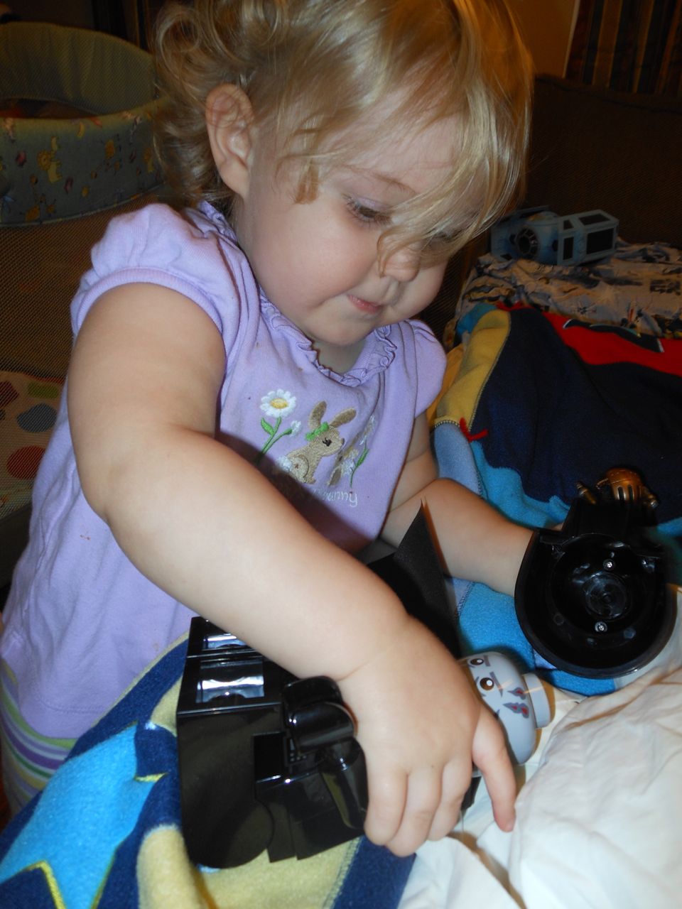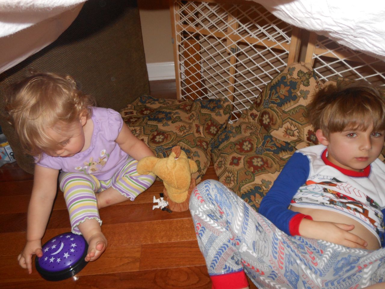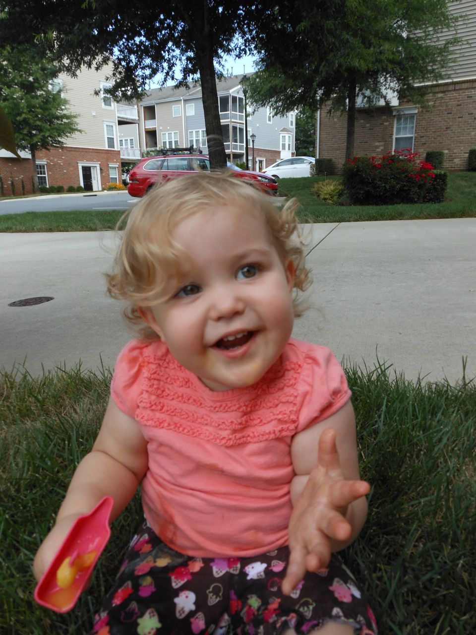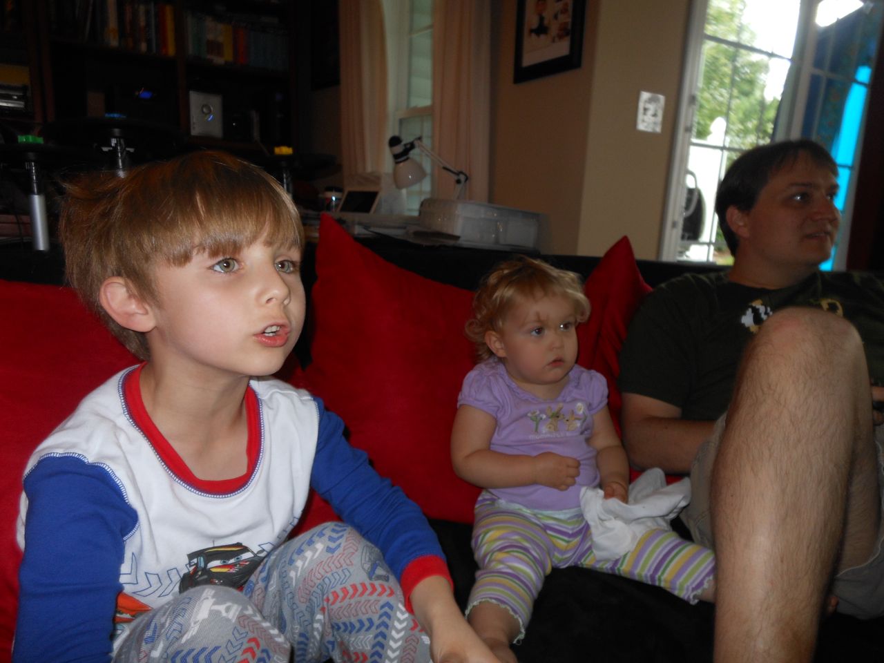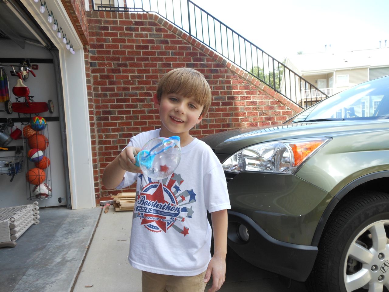 With the top floor’s air conditioning unit being broken for the past few days (why does this sort of thing always happen around a holiday?!) it finally became unbearable upstairs.. So, we had a family sleepover, together on the middle level. Brandon and I had the pull-out couch, Brian had the other couch, and Kendall (to her great displeasure) was in the pack’n’play. Not the most comfortable, but we made the most of it! The kids made all sorts of pillow forts and blanket tents, and that made it pretty fun. We brought down nightlights, one of which projects star shapes, and Brian’s Darth Vader flashlight. Kendall just loves taking off his helmet! We had fun playing a lot today, will the grill set, sidewalk chalk and bubbles, Lego Star Wars, stomp rocket, Star Wars figures, music toys… All over the map! We even brought out the Speak’n’Spell–a toy from TI that Brandon and I both had as kids, and really enjoyed. Brandon’s been working hard on the garage project, and check out that awesome wall system he’s got going now! Getting those items off the floor will help a lot. After Kendall’s nap, we decided to have our homemade popsicles (made from fruit, vanilla pudding, and orange juice) outside–they are tasty, but very messy! The kids got super sticky, and then super silly as the sugar took hold. Brian played with the stomp rocket as Kendall looked on–she got so excited every time Brian launched it! You can tell from her reaction, this was the height of entertainment! While working in the garage, Brandon found some unused “highly-available beverage helmets” that celebrated a Red Hat Cluster Suite release a few years ago. We tried to get Kendall to pose with one on, but she wasn’t exactly into the helmet look today. 😉 All in all, a super fun summer Sunday.