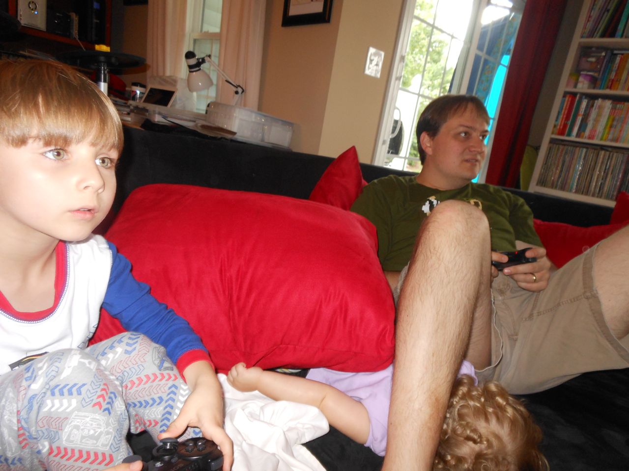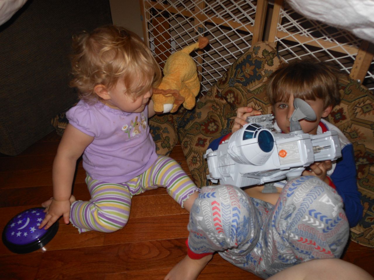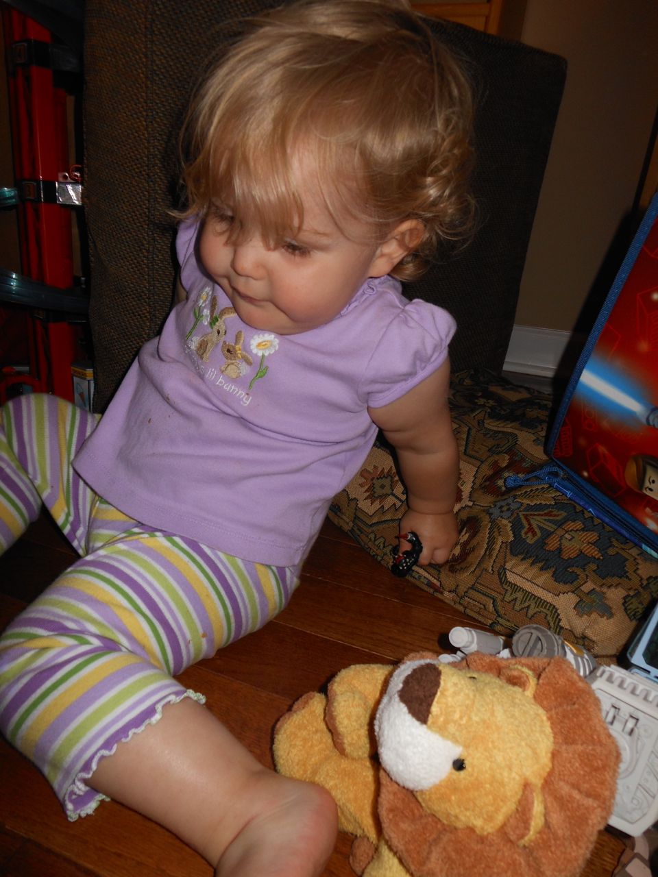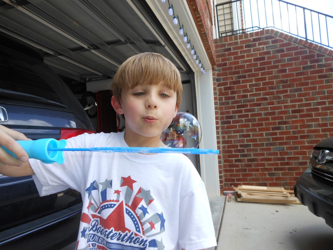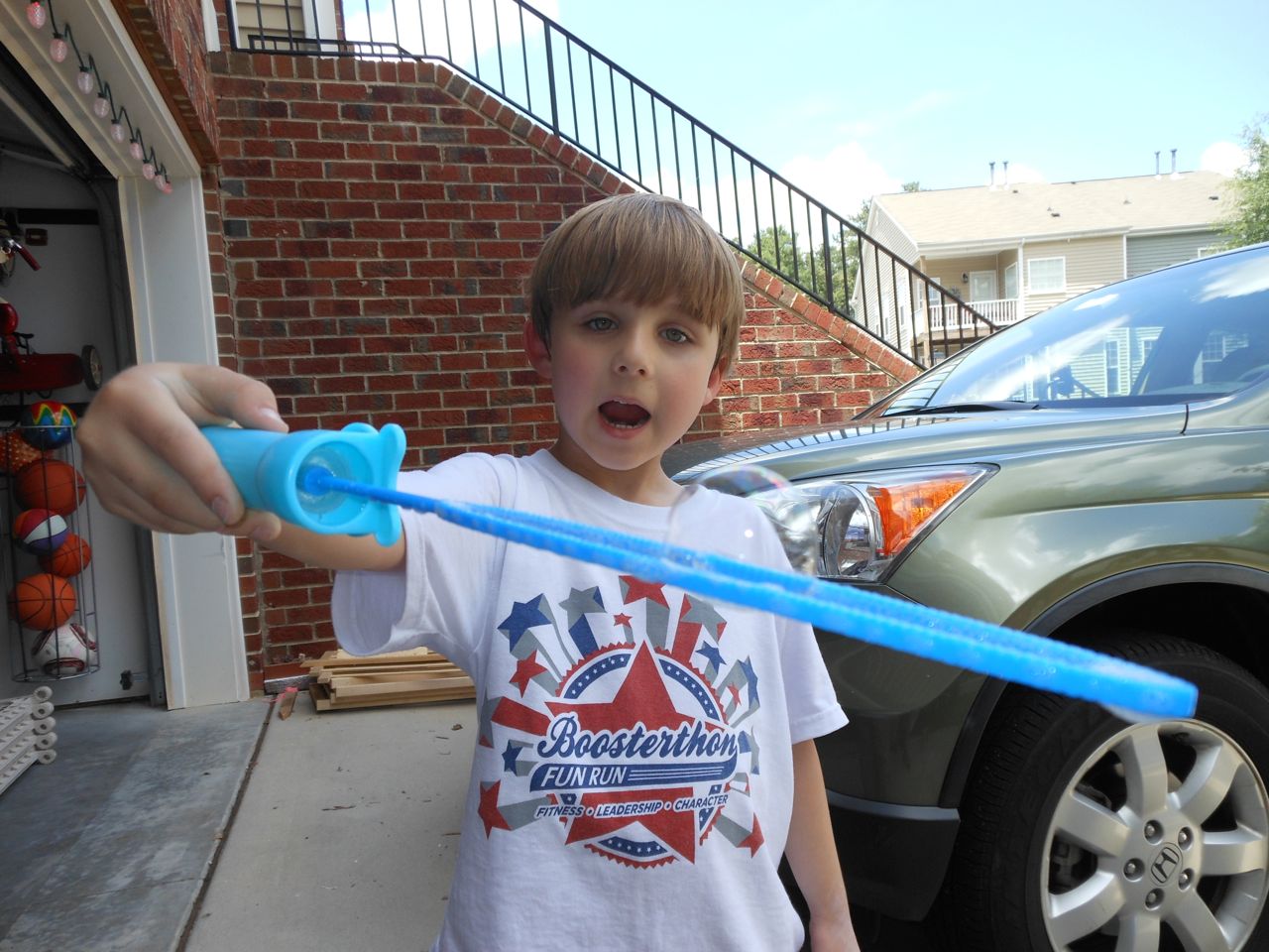 With the top floor’s air conditioning unit being broken for the past few days (why does this sort of thing always happen around a holiday?!) it finally became unbearable upstairs.. So, we had a family sleepover, together on the middle level. Brandon and I had the pull-out couch, Brian had the other couch, and Kendall (to her great displeasure) was in the pack’n’play. Not the most comfortable, but we made the most of it! The kids made all sorts of pillow forts and blanket tents, and that made it pretty fun. We brought down nightlights, one of which projects star shapes, and Brian’s Darth Vader flashlight. Kendall just loves taking off his helmet! We had fun playing a lot today, will the grill set, sidewalk chalk and bubbles, Lego Star Wars, stomp rocket, Star Wars figures, music toys… All over the map! We even brought out the Speak’n’Spell–a toy from TI that Brandon and I both had as kids, and really enjoyed. Brandon’s been working hard on the garage project, and check out that awesome wall system he’s got going now! Getting those items off the floor will help a lot. After Kendall’s nap, we decided to have our homemade popsicles (made from fruit, vanilla pudding, and orange juice) outside–they are tasty, but very messy! The kids got super sticky, and then super silly as the sugar took hold. Brian played with the stomp rocket as Kendall looked on–she got so excited every time Brian launched it! You can tell from her reaction, this was the height of entertainment! While working in the garage, Brandon found some unused “highly-available beverage helmets” that celebrated a Red Hat Cluster Suite release a few years ago. We tried to get Kendall to pose with one on, but she wasn’t exactly into the helmet look today. 😉 All in all, a super fun summer Sunday.