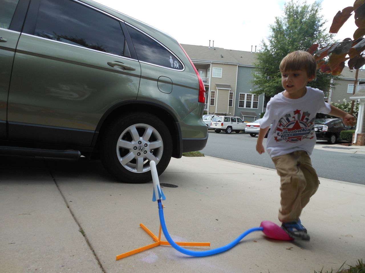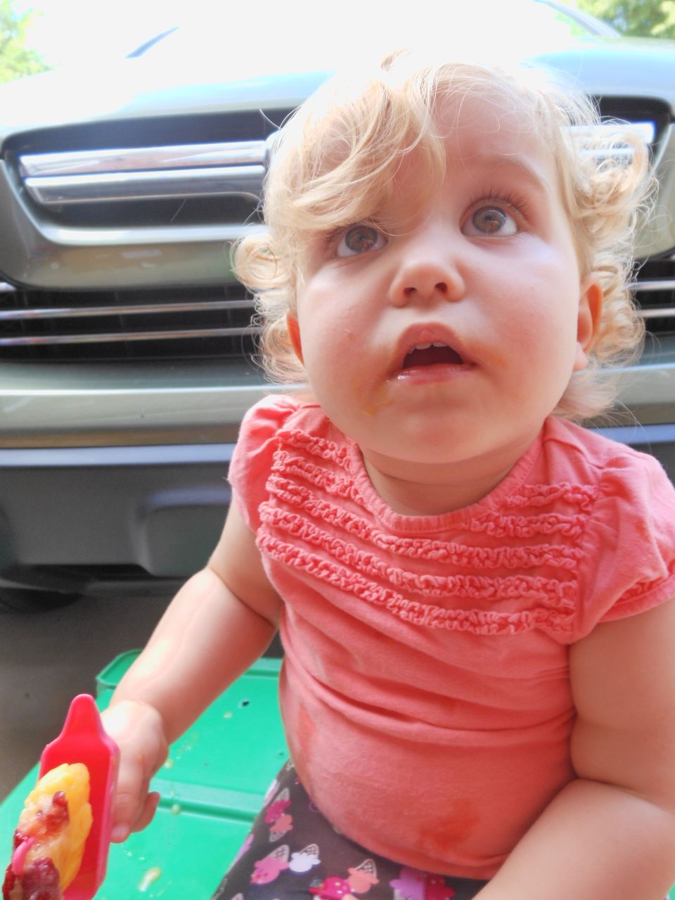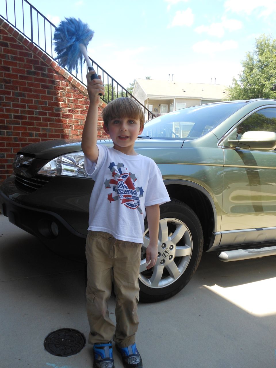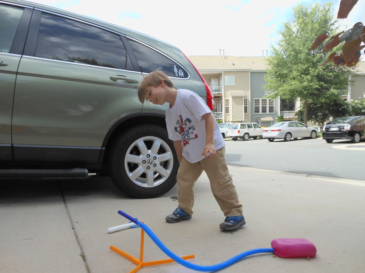 With the top floor’s air conditioning unit being broken for the past few days (why does this sort of thing always happen around a holiday?!) it finally became unbearable upstairs.. So, we had a family sleepover, together on the middle level. Brandon and I had the pull-out couch, Brian had the other couch, and Kendall (to her great displeasure) was in the pack’n’play. Not the most comfortable, but we made the most of it! The kids made all sorts of pillow forts and blanket tents, and that made it pretty fun. We brought down nightlights, one of which projects star shapes, and Brian’s Darth Vader flashlight. Kendall just loves taking off his helmet! We had fun playing a lot today, will the grill set, sidewalk chalk and bubbles, Lego Star Wars, stomp rocket, Star Wars figures, music toys… All over the map! We even brought out the Speak’n’Spell–a toy from TI that Brandon and I both had as kids, and really enjoyed. Brandon’s been working hard on the garage project, and check out that awesome wall system he’s got going now! Getting those items off the floor will help a lot. After Kendall’s nap, we decided to have our homemade popsicles (made from fruit, vanilla pudding, and orange juice) outside–they are tasty, but very messy! The kids got super sticky, and then super silly as the sugar took hold. Brian played with the stomp rocket as Kendall looked on–she got so excited every time Brian launched it! You can tell from her reaction, this was the height of entertainment! While working in the garage, Brandon found some unused “highly-available beverage helmets” that celebrated a Red Hat Cluster Suite release a few years ago. We tried to get Kendall to pose with one on, but she wasn’t exactly into the helmet look today. 😉 All in all, a super fun summer Sunday.
