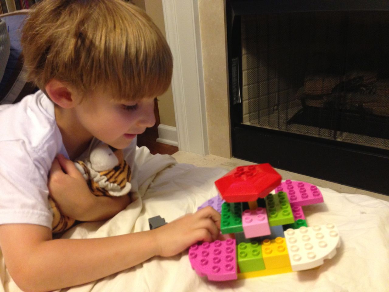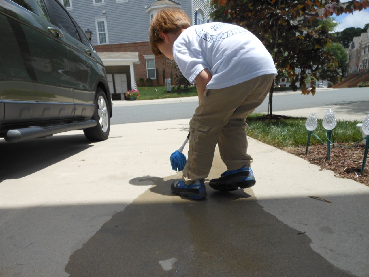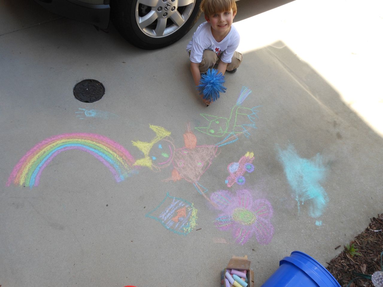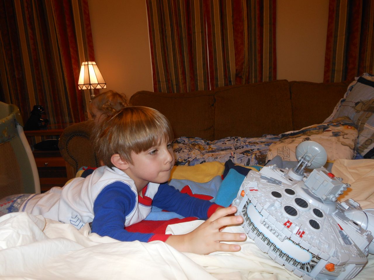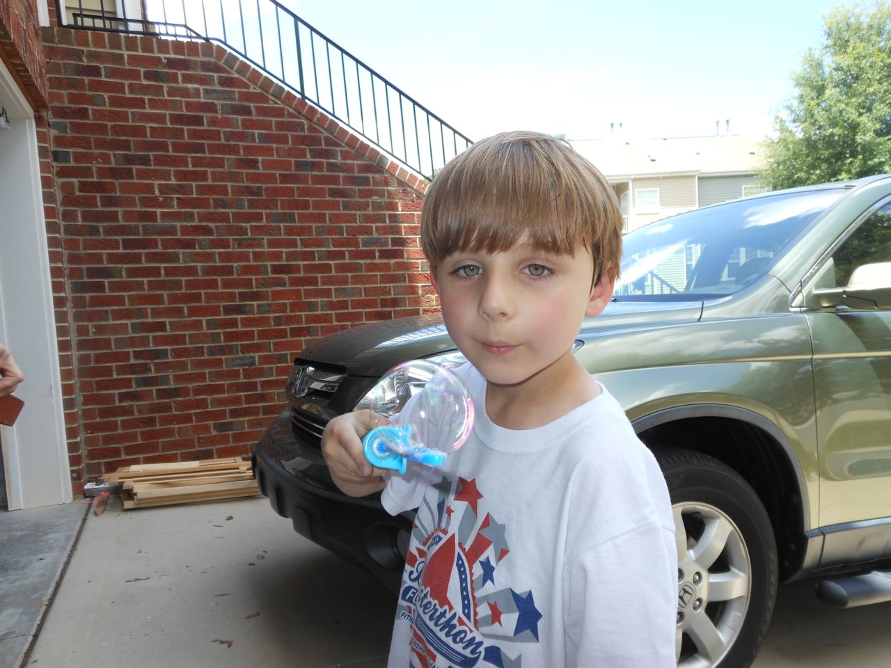 With the top floor’s air conditioning unit being broken for the past few days (why does this sort of thing always happen around a holiday?!) it finally became unbearable upstairs.. So, we had a family sleepover, together on the middle level. Brandon and I had the pull-out couch, Brian had the other couch, and Kendall (to her great displeasure) was in the pack’n’play. Not the most comfortable, but we made the most of it! The kids made all sorts of pillow forts and blanket tents, and that made it pretty fun. We brought down nightlights, one of which projects star shapes, and Brian’s Darth Vader flashlight. Kendall just loves taking off his helmet! We had fun playing a lot today, will the grill set, sidewalk chalk and bubbles, Lego Star Wars, stomp rocket, Star Wars figures, music toys… All over the map! We even brought out the Speak’n’Spell–a toy from TI that Brandon and I both had as kids, and really enjoyed. Brandon’s been working hard on the garage project, and check out that awesome wall system he’s got going now! Getting those items off the floor will help a lot. After Kendall’s nap, we decided to have our homemade popsicles (made from fruit, vanilla pudding, and orange juice) outside–they are tasty, but very messy! The kids got super sticky, and then super silly as the sugar took hold. Brian played with the stomp rocket as Kendall looked on–she got so excited every time Brian launched it! You can tell from her reaction, this was the height of entertainment! While working in the garage, Brandon found some unused “highly-available beverage helmets” that celebrated a Red Hat Cluster Suite release a few years ago. We tried to get Kendall to pose with one on, but she wasn’t exactly into the helmet look today. 😉 All in all, a super fun summer Sunday.