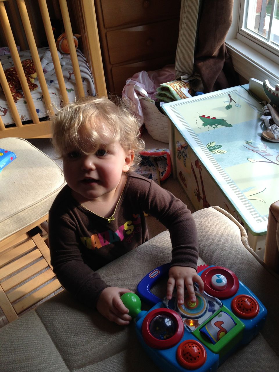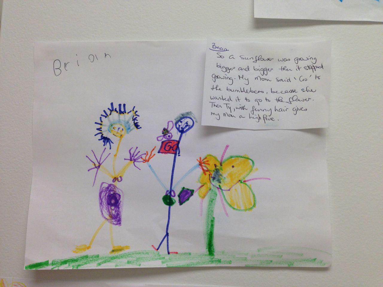 It’s new shoes day at the Perkins household–and not to be totally predictable, but it’s Hello Kitty and Star Wars! 🙂 I thought they were so cute together. Kendall was very cute this morning, rocking out to the toy radio. She seems pretty proud of her new Kitty shoes! Also, here’s a picture of one of Brian’s many artworks on the wall at school. I love it when his teachers transcribe his narratives of what his drawings are about. I can tell they do it with as little editing as possible–his voice really comes through. I really appreciate these peeks into his world.