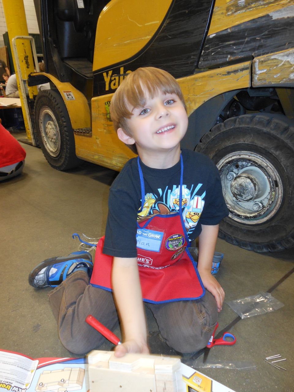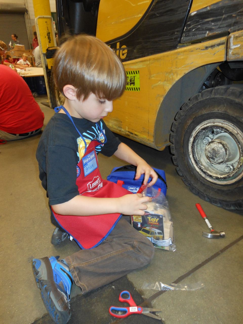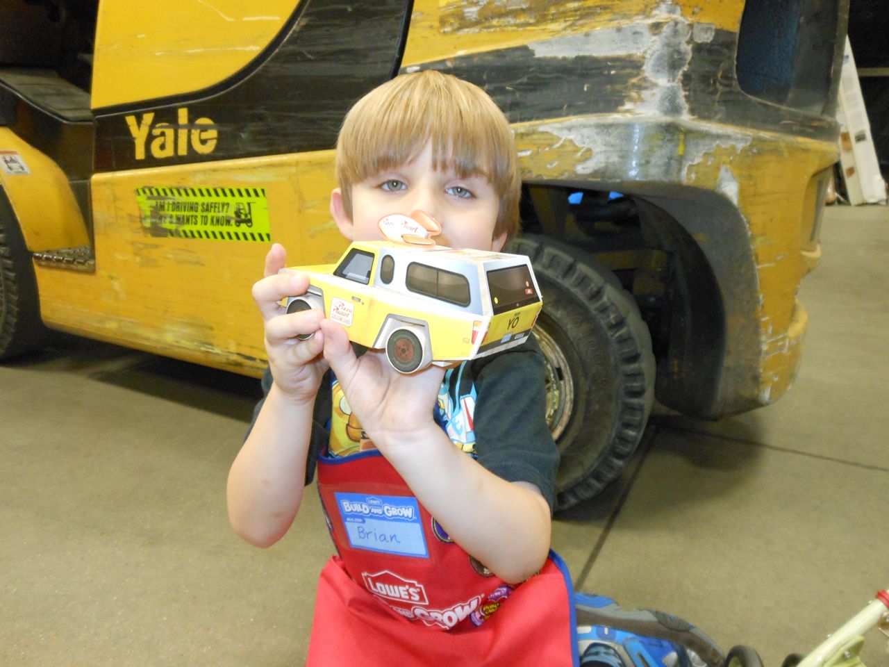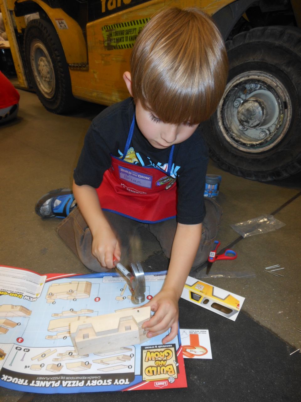 Another busy Saturday! This morning I had to step out early to get my hair done, while Brandon and the kids headed to Lowes for another Build and Grow event! Today Brian built a Pizza Planet delivery car, as featured in the Toy Story movies. Poor Kendall had to watch from her stroller! Brian had been begging for a key from the custom key cutting area in Lowes–a house key printed with an M&M pattern. Brandon gave in, and even had it cut for him–so now Brian has his first house key.