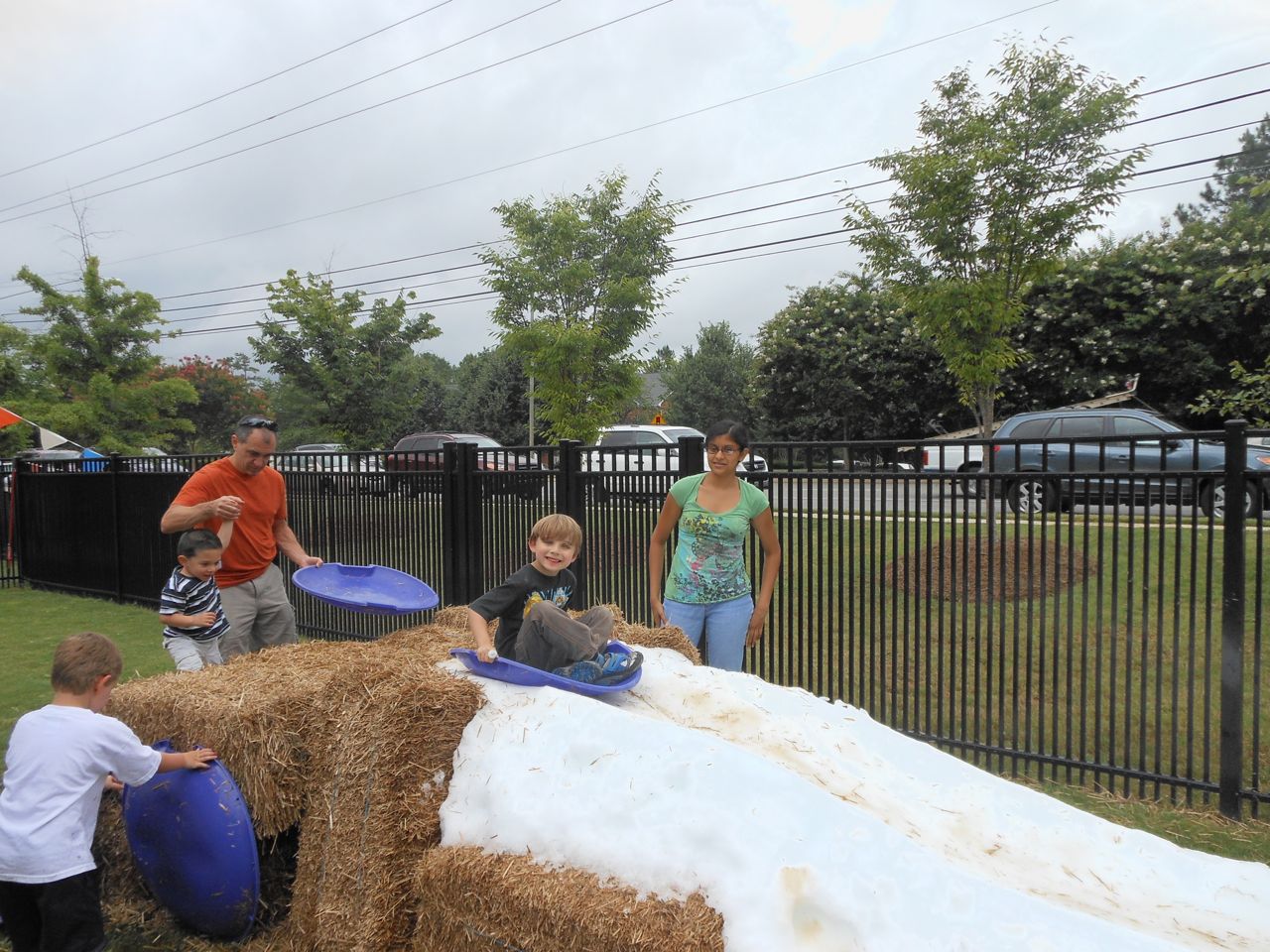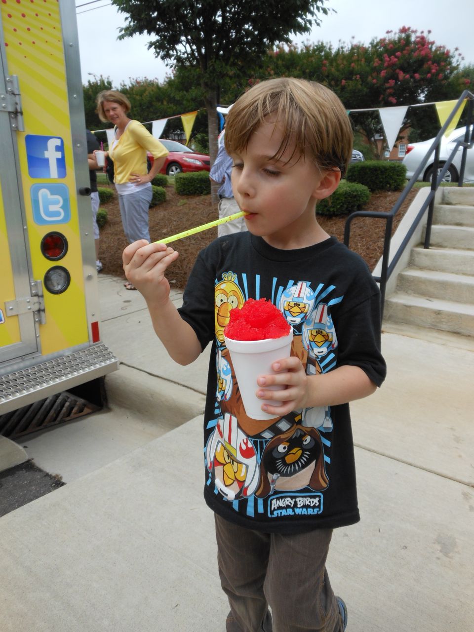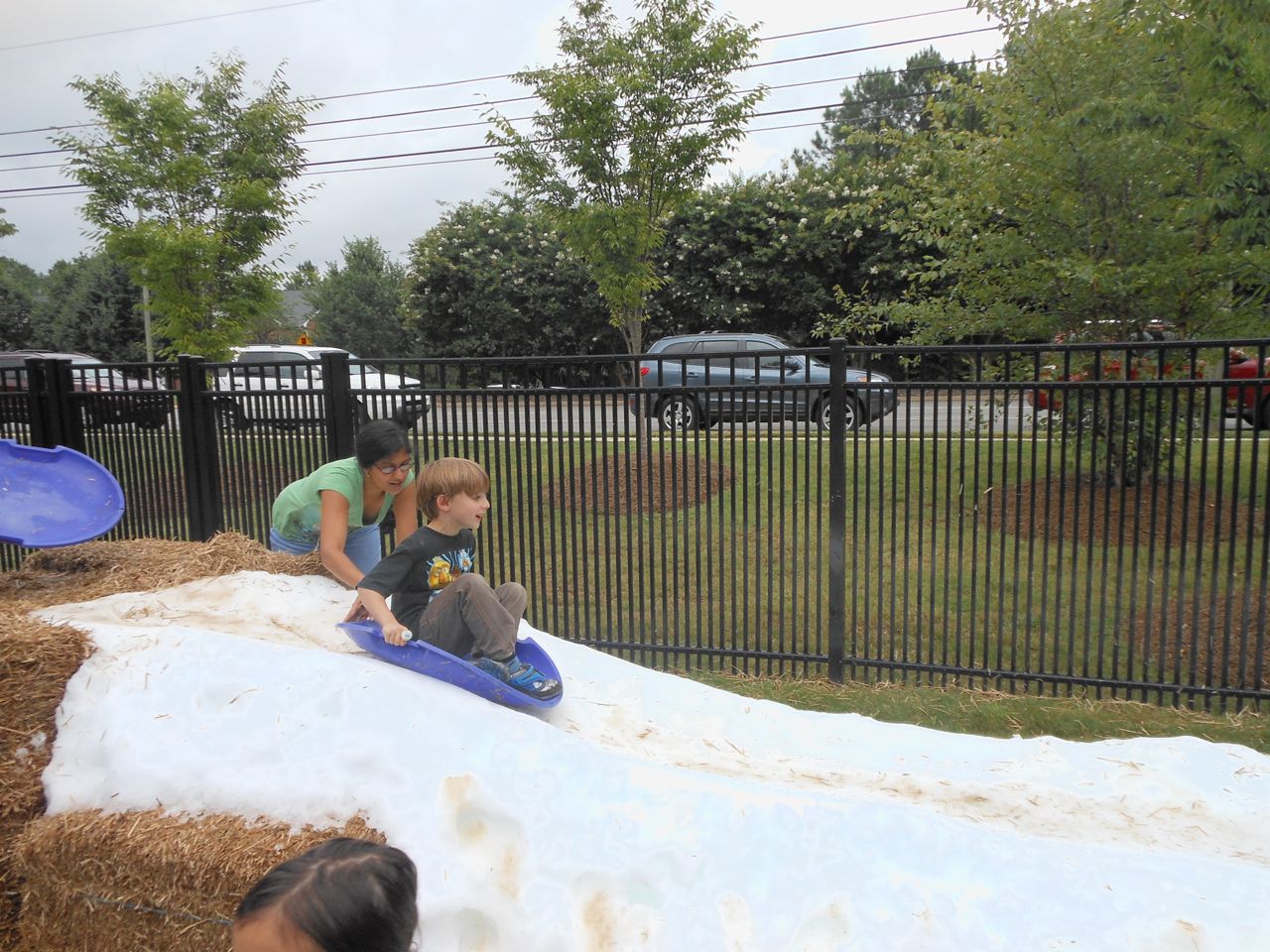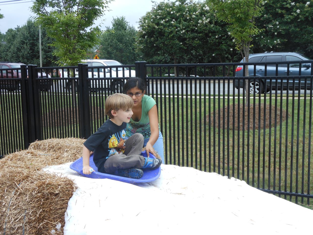 Afterward, it was off to school. Yes, school on a Saturday–but we usually make the effort to make it to Goddard’s Open House events! I met up with the crew over at school and we enjoyed some cookout fare on the playground, and the kids enjoyed the toys and a musical performance! (The duo didn’t know any Ramones tunes, however–Brian asked!) 😉 Brian is way too big for the toddler playground’s cars, but he loves them anyway! The kids enjoyed visiting all the classrooms, seeing their favorite teachers (Kendall loves Ms. Jackie, who was her teacher in the infant room–she says “Jackeeeeee!” when she sees her!) Brian showed me the produce his class has been growing all summer, with a display in his classroom, and a tour of his garden plot outside! He gave me the rundown on what is growing where, exactly how many of each vegetable they’ve had, and he was disappointed that the sunflowers were already past their prime (they were pretty spectacular earlier in the week!) Brian was pleased to see that Ms. Vineeta had put up the party banner exactly where he’d suggested on Friday afternoon. 🙂 We let Brian get a treat from the Kona Ice truck, and of course he picked the reddest red slushy there was! Luckily he was a nice big brother and shared with Kendall. They really are so great together. 🙂 On the big playground, there was a sledding setup, made with real snow! Sort of a Christmas-in-July treat for the kids. 🙂 Brian loved it just as much as he did back in January (for the warmest “Let It Snow” party you could imagine!)