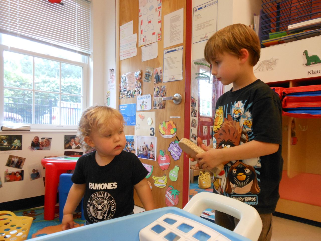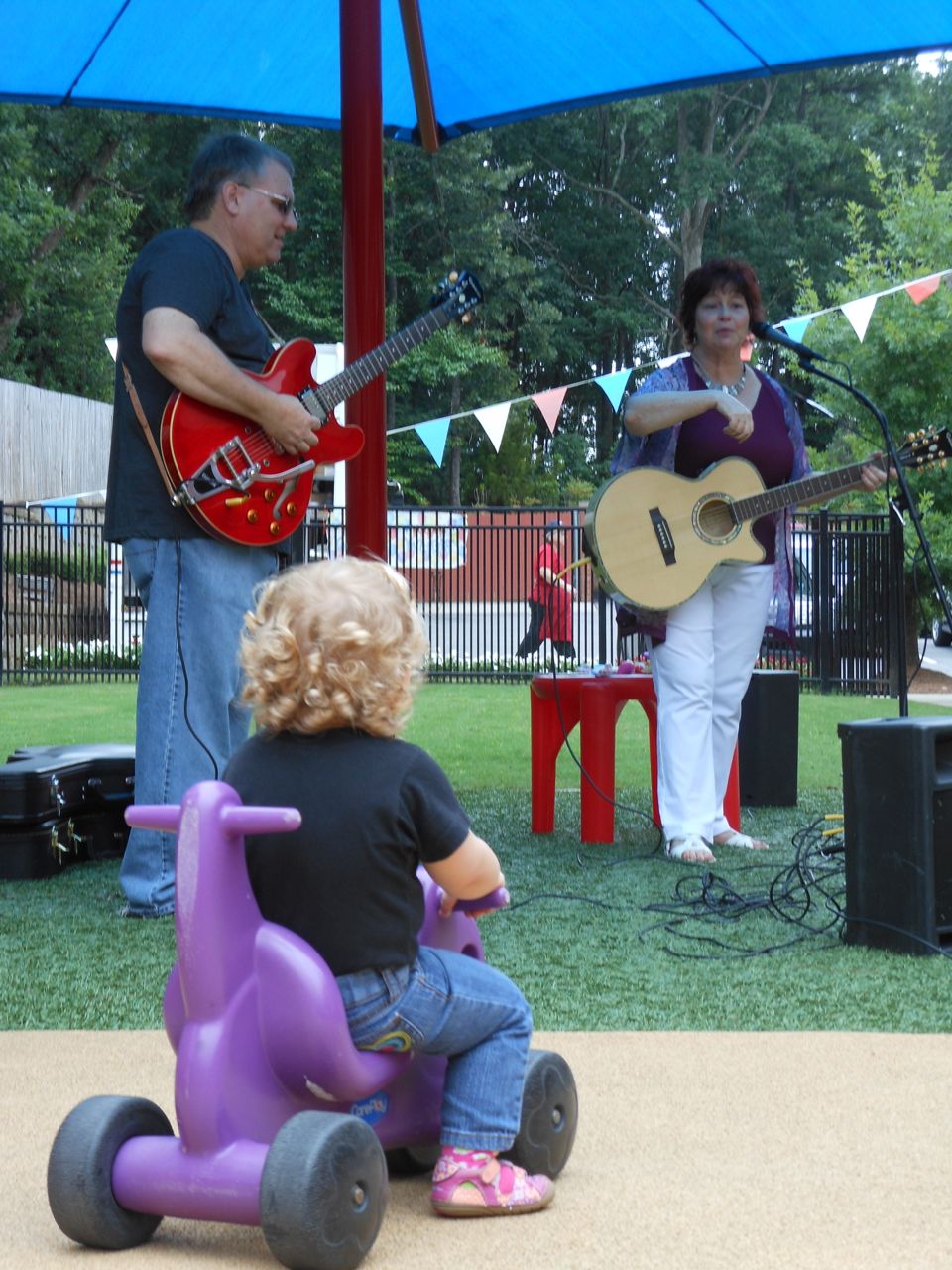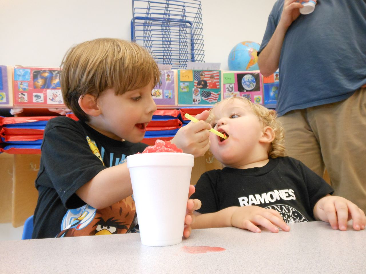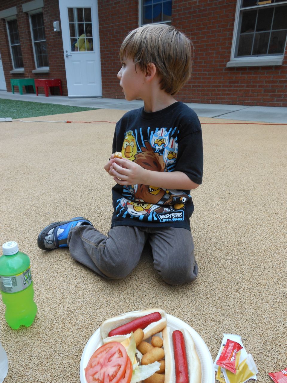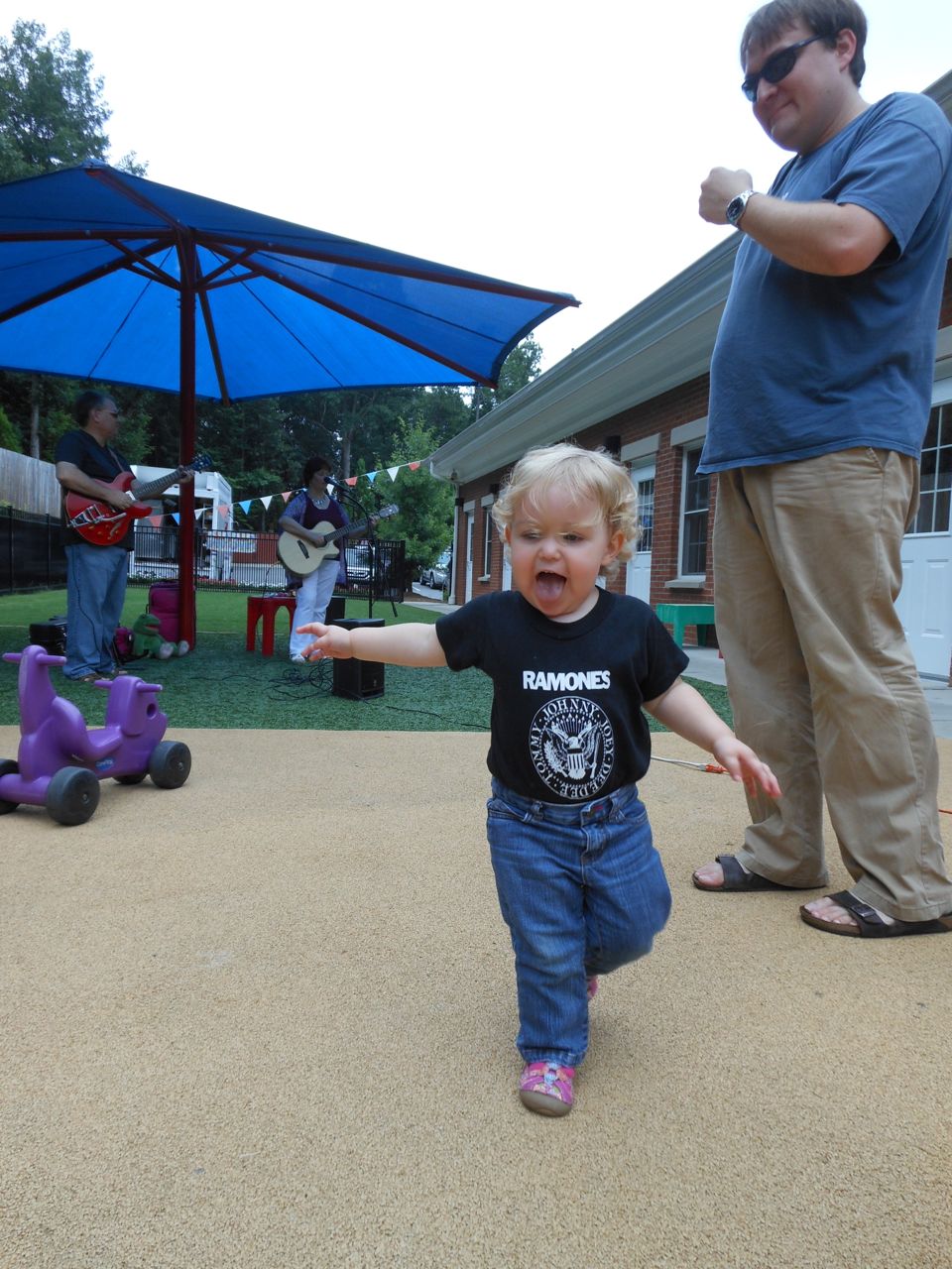 Afterward, it was off to school. Yes, school on a Saturday–but we usually make the effort to make it to Goddard’s Open House events! I met up with the crew over at school and we enjoyed some cookout fare on the playground, and the kids enjoyed the toys and a musical performance! (The duo didn’t know any Ramones tunes, however–Brian asked!) 😉 Brian is way too big for the toddler playground’s cars, but he loves them anyway! The kids enjoyed visiting all the classrooms, seeing their favorite teachers (Kendall loves Ms. Jackie, who was her teacher in the infant room–she says “Jackeeeeee!” when she sees her!) Brian showed me the produce his class has been growing all summer, with a display in his classroom, and a tour of his garden plot outside! He gave me the rundown on what is growing where, exactly how many of each vegetable they’ve had, and he was disappointed that the sunflowers were already past their prime (they were pretty spectacular earlier in the week!) Brian was pleased to see that Ms. Vineeta had put up the party banner exactly where he’d suggested on Friday afternoon. 🙂 We let Brian get a treat from the Kona Ice truck, and of course he picked the reddest red slushy there was! Luckily he was a nice big brother and shared with Kendall. They really are so great together. 🙂 On the big playground, there was a sledding setup, made with real snow! Sort of a Christmas-in-July treat for the kids. 🙂 Brian loved it just as much as he did back in January (for the warmest “Let It Snow” party you could imagine!)