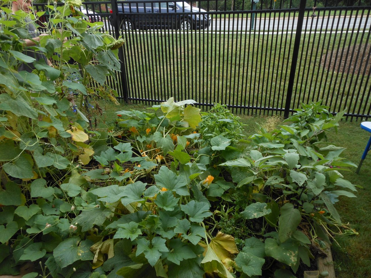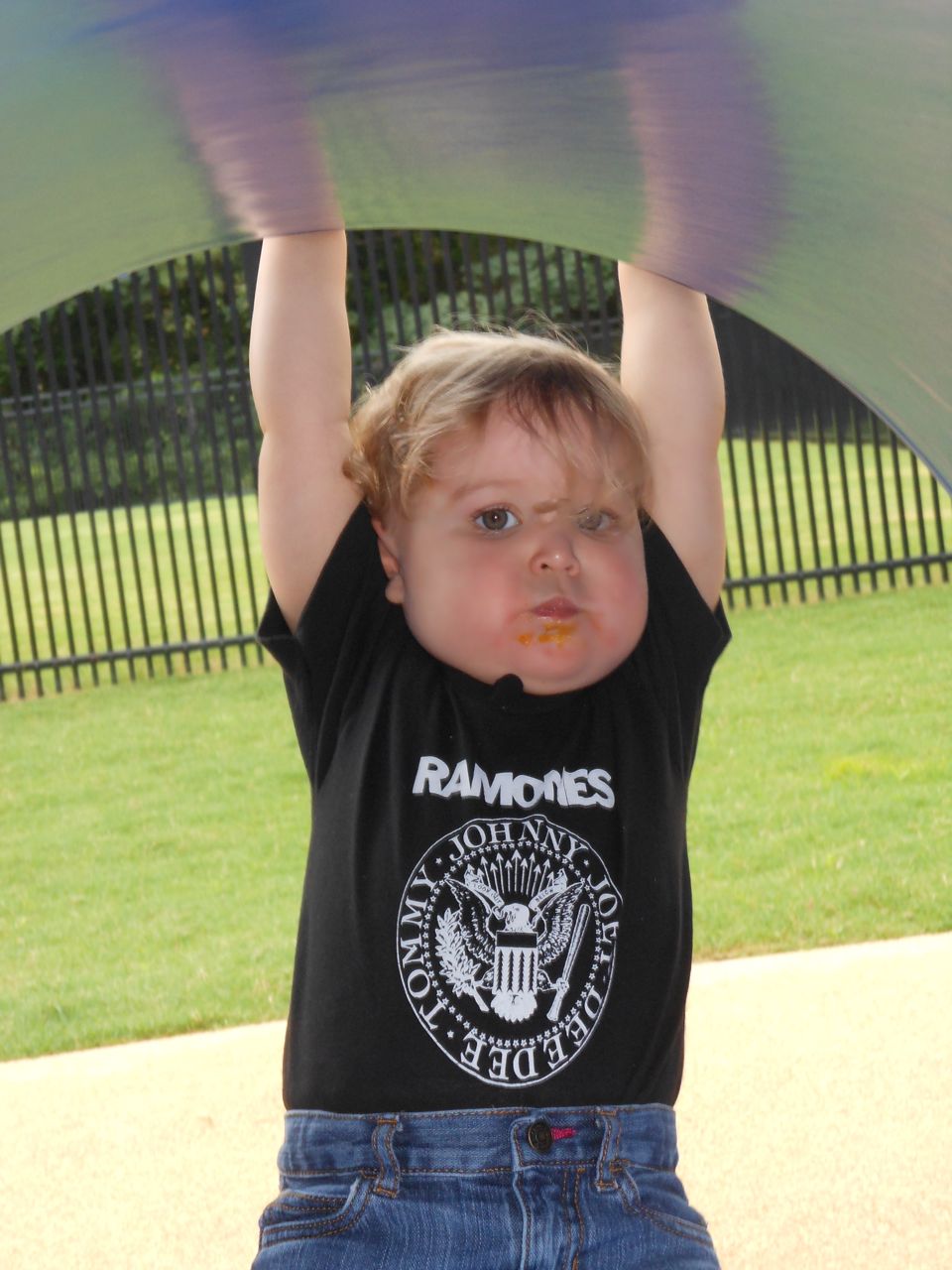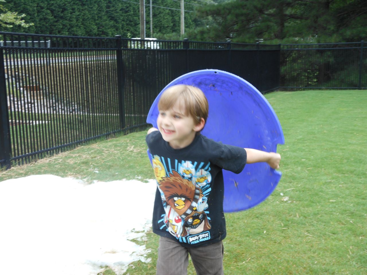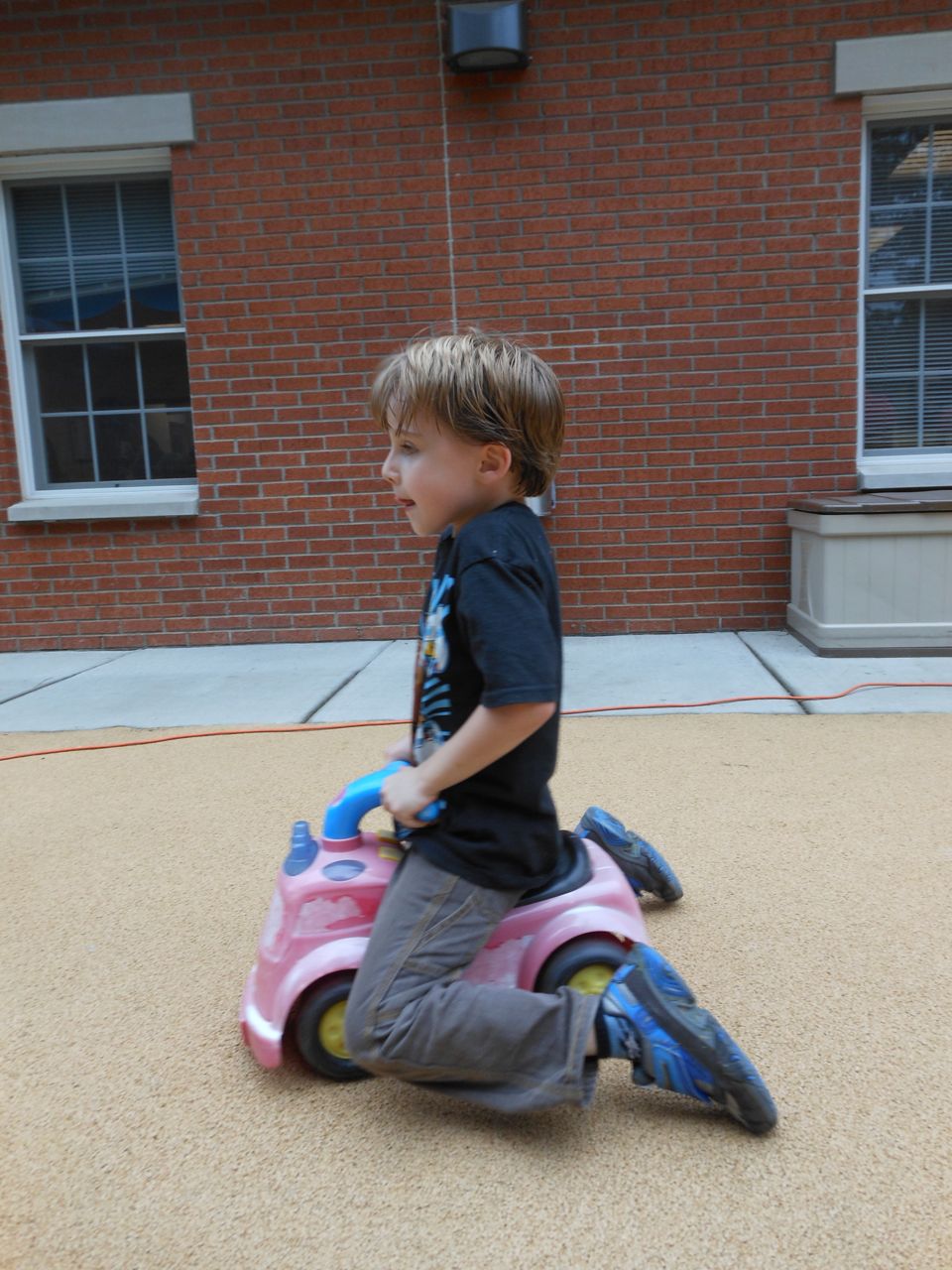 Afterward, it was off to school. Yes, school on a Saturday–but we usually make the effort to make it to Goddard’s Open House events! I met up with the crew over at school and we enjoyed some cookout fare on the playground, and the kids enjoyed the toys and a musical performance! (The duo didn’t know any Ramones tunes, however–Brian asked!) 😉 Brian is way too big for the toddler playground’s cars, but he loves them anyway! The kids enjoyed visiting all the classrooms, seeing their favorite teachers (Kendall loves Ms. Jackie, who was her teacher in the infant room–she says “Jackeeeeee!” when she sees her!) Brian showed me the produce his class has been growing all summer, with a display in his classroom, and a tour of his garden plot outside! He gave me the rundown on what is growing where, exactly how many of each vegetable they’ve had, and he was disappointed that the sunflowers were already past their prime (they were pretty spectacular earlier in the week!) Brian was pleased to see that Ms. Vineeta had put up the party banner exactly where he’d suggested on Friday afternoon. 🙂 We let Brian get a treat from the Kona Ice truck, and of course he picked the reddest red slushy there was! Luckily he was a nice big brother and shared with Kendall. They really are so great together. 🙂 On the big playground, there was a sledding setup, made with real snow! Sort of a Christmas-in-July treat for the kids. 🙂 Brian loved it just as much as he did back in January (for the warmest “Let It Snow” party you could imagine!)