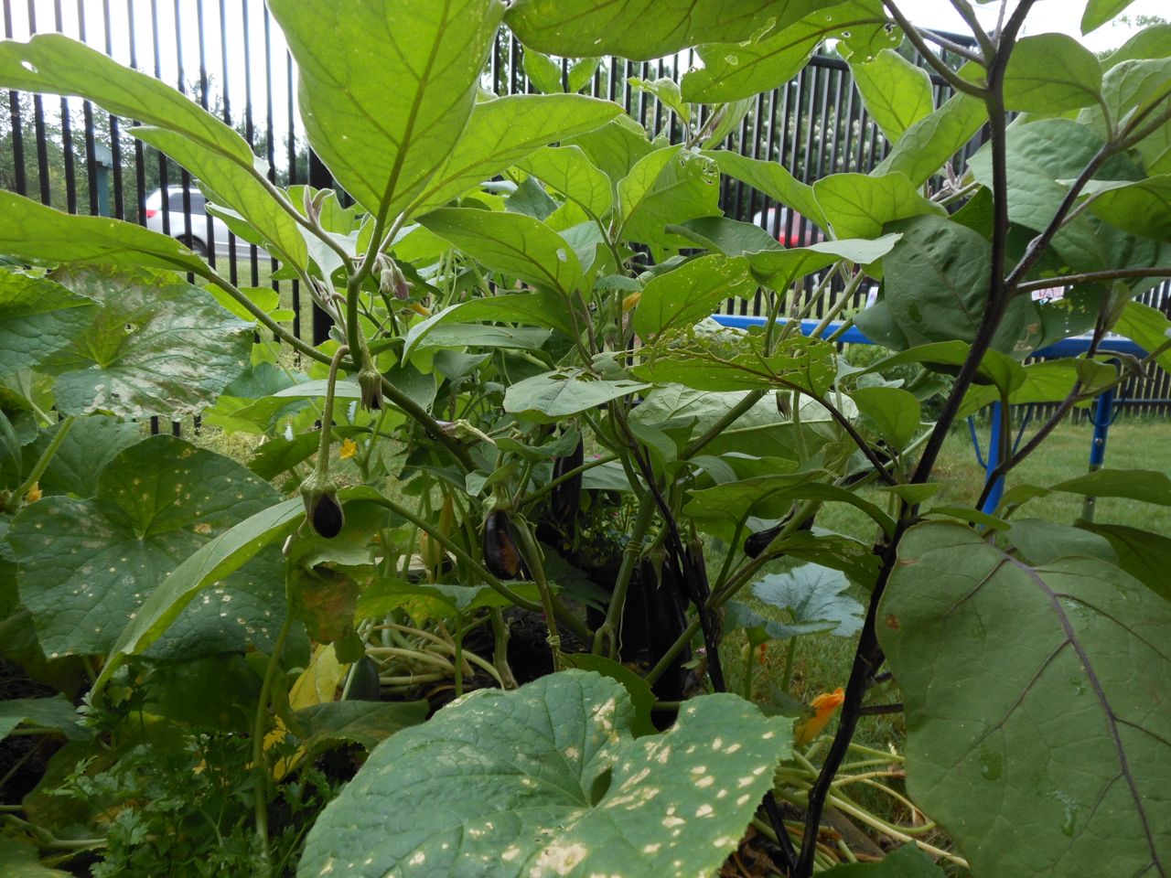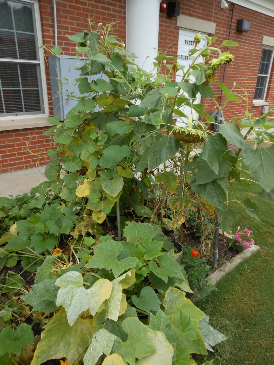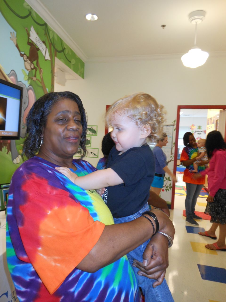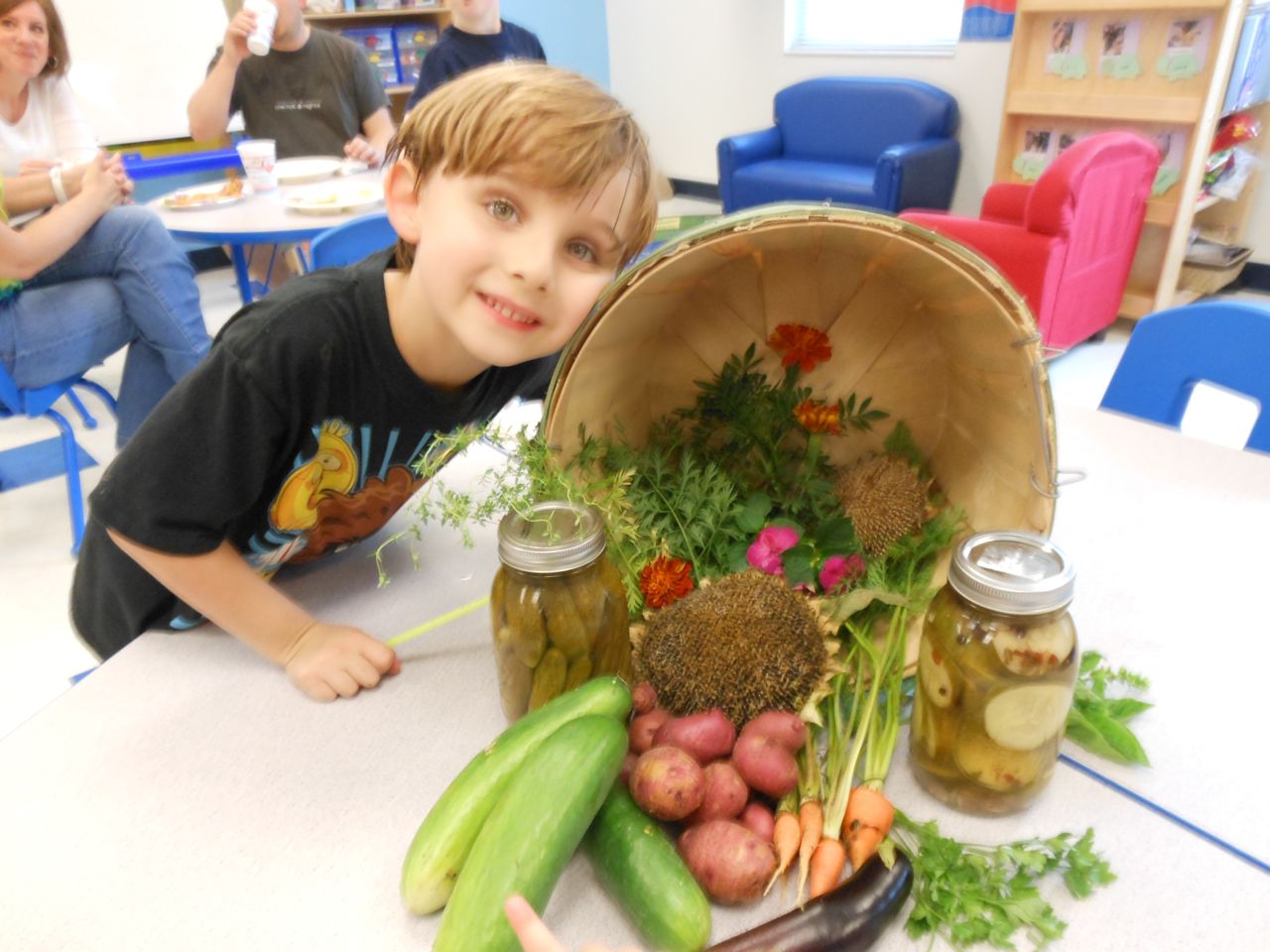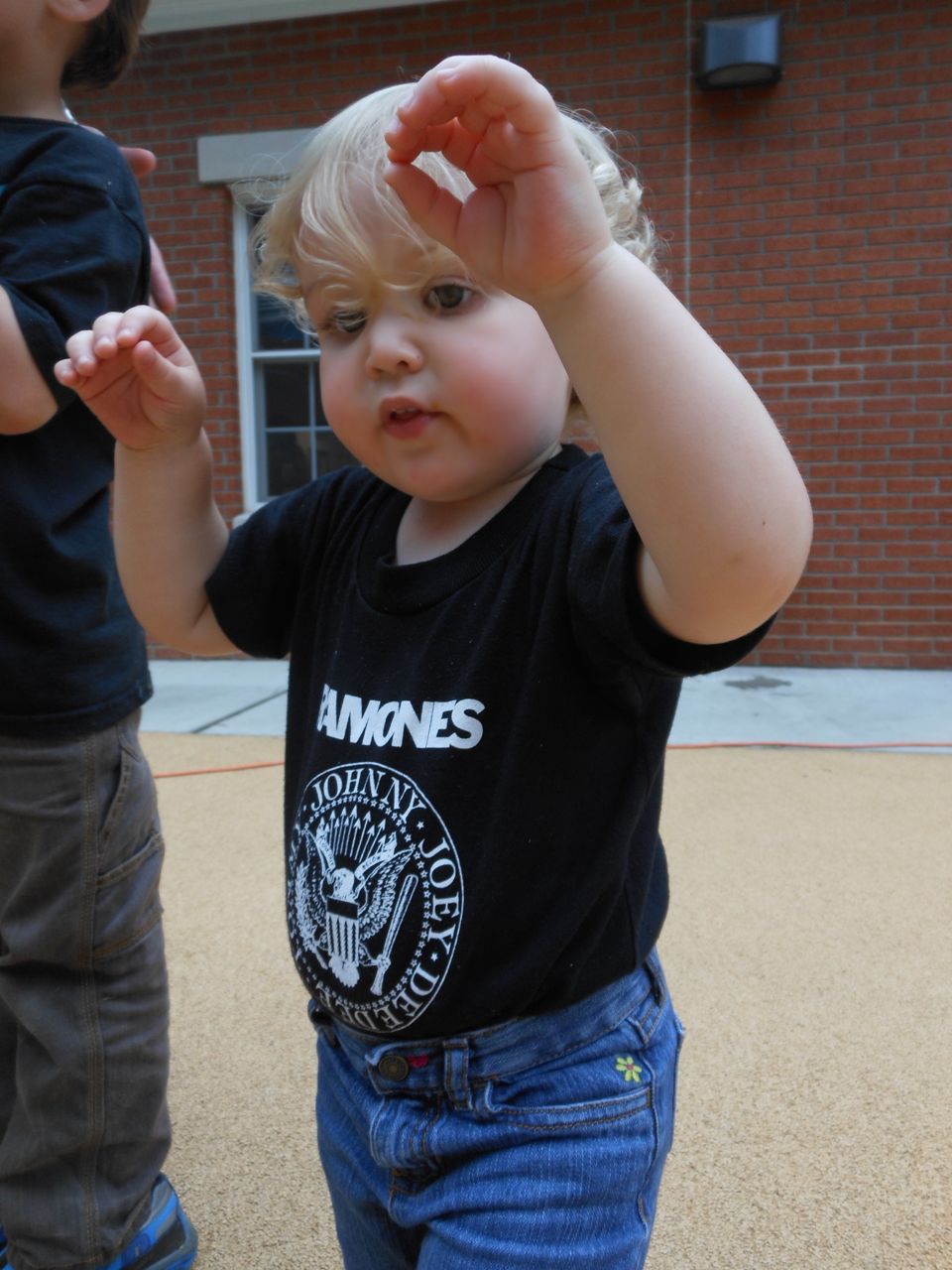 Afterward, it was off to school. Yes, school on a Saturday–but we usually make the effort to make it to Goddard’s Open House events! I met up with the crew over at school and we enjoyed some cookout fare on the playground, and the kids enjoyed the toys and a musical performance! (The duo didn’t know any Ramones tunes, however–Brian asked!) 😉 Brian is way too big for the toddler playground’s cars, but he loves them anyway! The kids enjoyed visiting all the classrooms, seeing their favorite teachers (Kendall loves Ms. Jackie, who was her teacher in the infant room–she says “Jackeeeeee!” when she sees her!) Brian showed me the produce his class has been growing all summer, with a display in his classroom, and a tour of his garden plot outside! He gave me the rundown on what is growing where, exactly how many of each vegetable they’ve had, and he was disappointed that the sunflowers were already past their prime (they were pretty spectacular earlier in the week!) Brian was pleased to see that Ms. Vineeta had put up the party banner exactly where he’d suggested on Friday afternoon. 🙂 We let Brian get a treat from the Kona Ice truck, and of course he picked the reddest red slushy there was! Luckily he was a nice big brother and shared with Kendall. They really are so great together. 🙂 On the big playground, there was a sledding setup, made with real snow! Sort of a Christmas-in-July treat for the kids. 🙂 Brian loved it just as much as he did back in January (for the warmest “Let It Snow” party you could imagine!)
