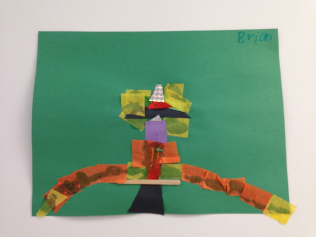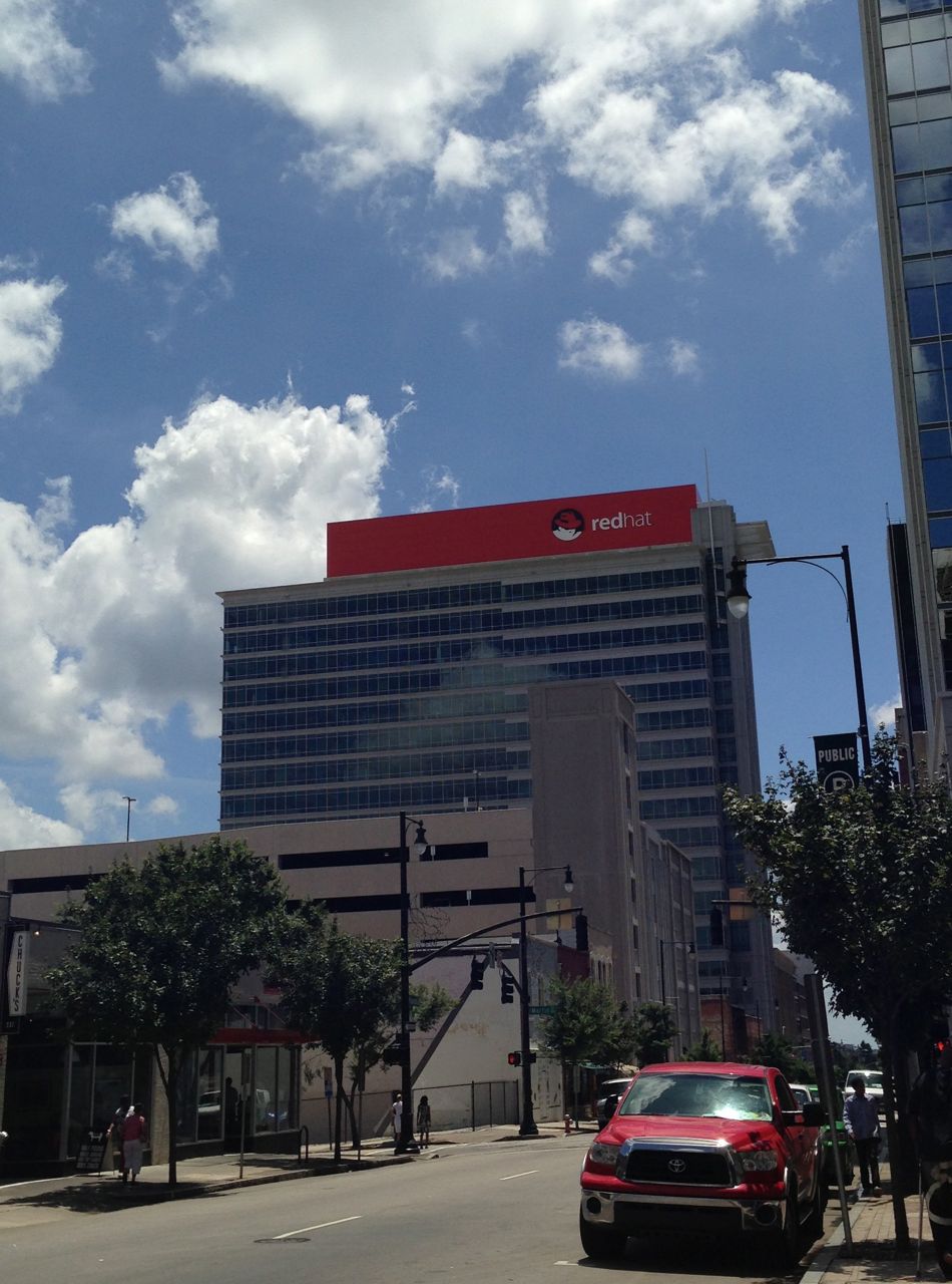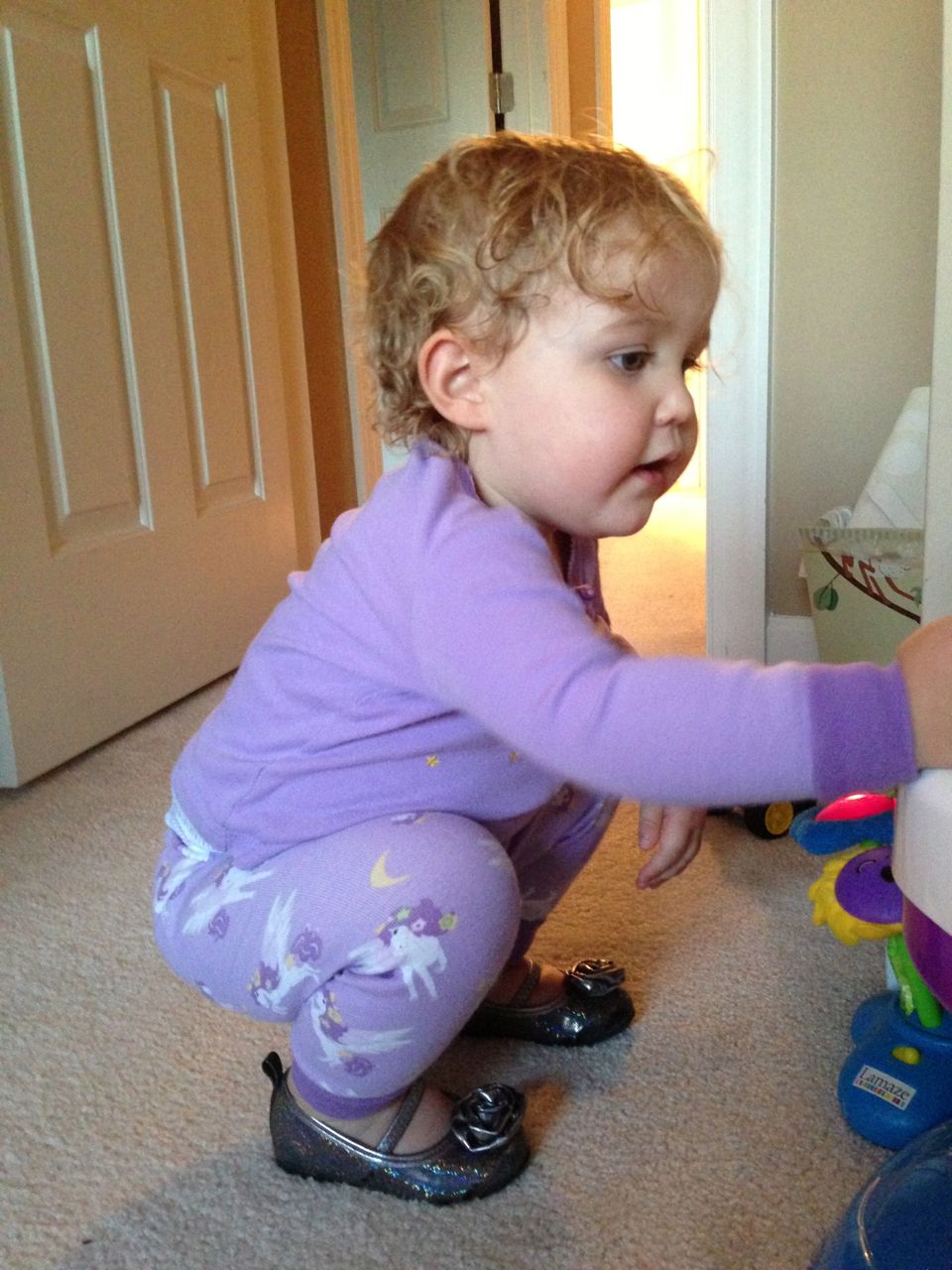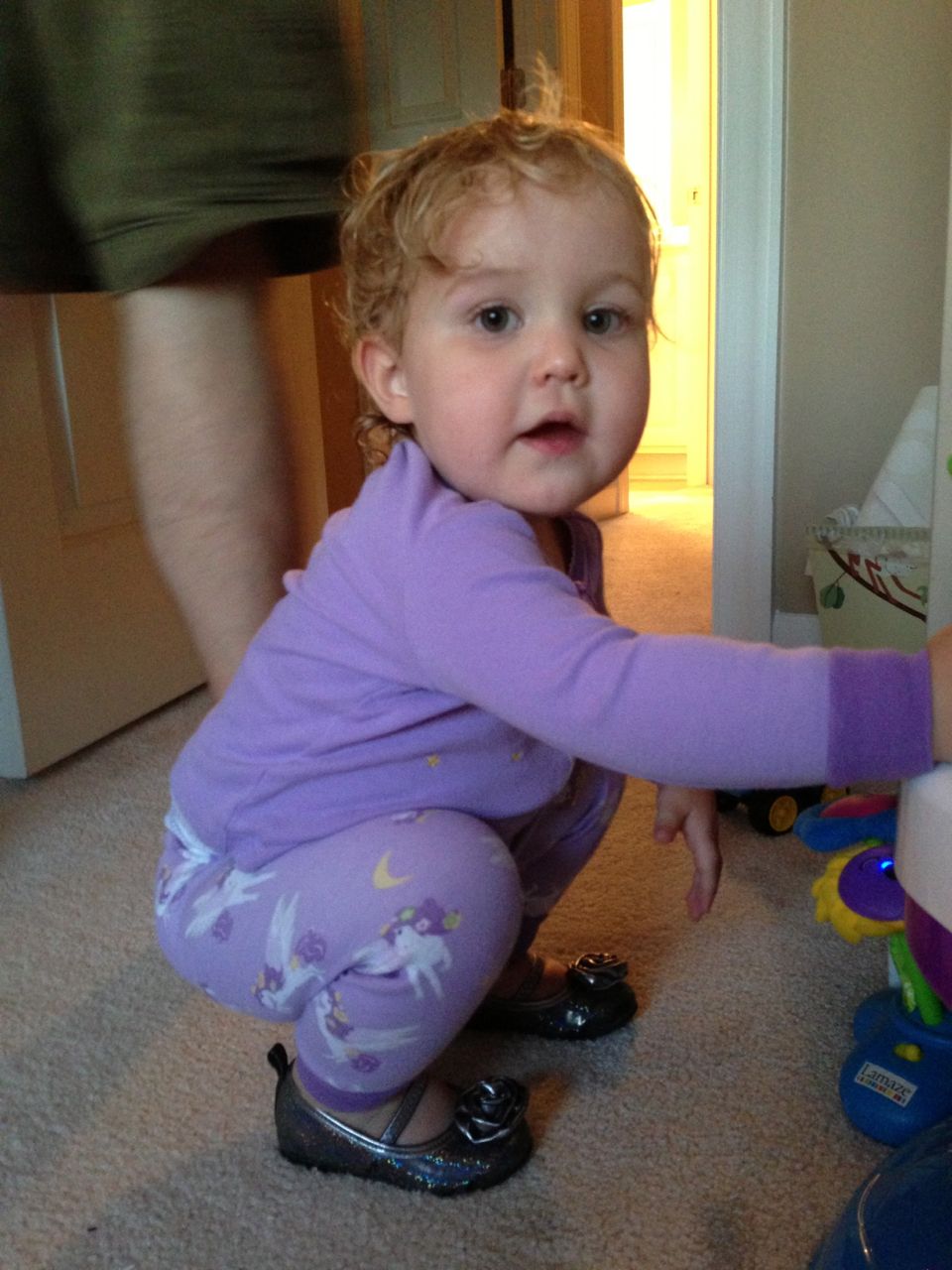 Today Brandon and I took a walk during lunchtime and noticed that we could see the newly-unveiled top of Red Hat Tower. (It has been covered up with scaffolding for months.) It’s awfully.. Red, isn’t it? But it is pretty striking in the bright summer sun. Also: one of Brian’s collage art pieces, on display in the hallway at school. Unfortunately I don’t know the story on this one..! And finally, Kendall playing in her PJs this evening–she found a pair of sparkly shoes I’d gotten her at a consignment sale. She certainly loves her shoes, and insisted on putting these on for awhile before going to bed. 🙂