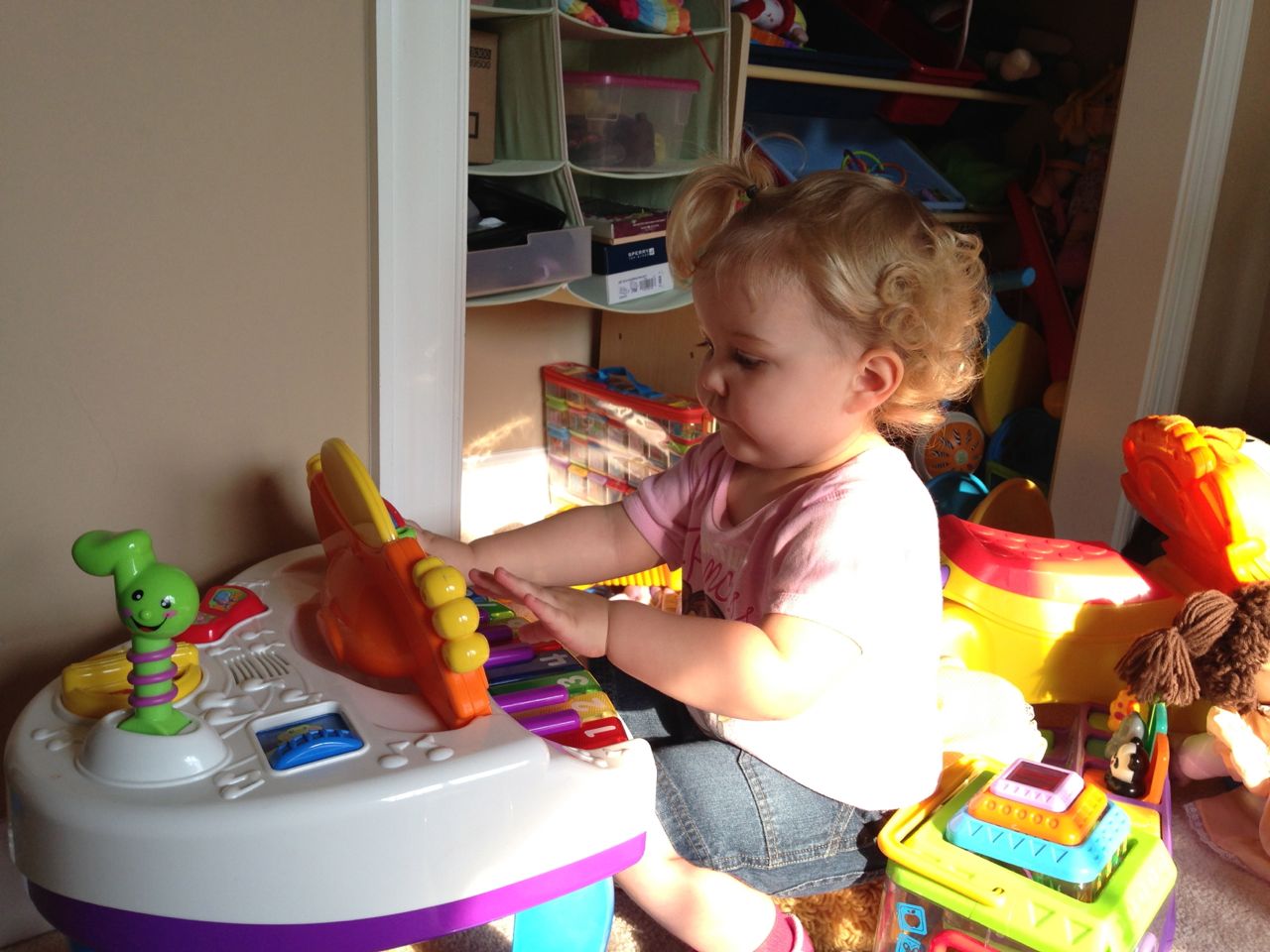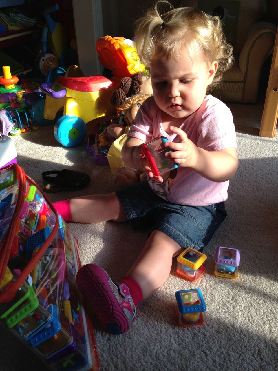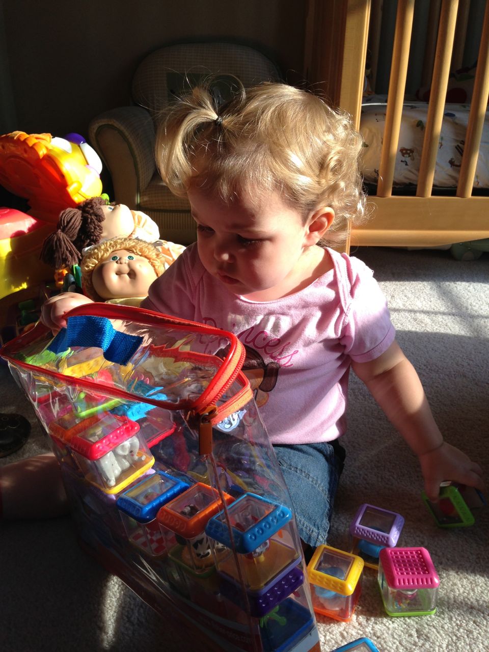 Kendall and I had some playtime this morning, while Brian was at speech! She was so cute in the morning sun. She danced to her radio, built with peek-a-blocks, played her piano, and made silly faces with lots of giggles when I turned on the phone’s front camera for her! Thanks to Grandma Sue, Kendall now has two of my granny’s Cabbage Patch dolls. These weren’t exactly for playing with when I was a kid, but I remember thinking how much I really wanted to play with that one in the yellow outfit with the curls and green eyes! I’m glad Kendall gets to enjoy the doll now–I’ve got a curly-haired baby girl of my own to dress up! (also: Brian wants to share his homework for his reading class, he drew this cool airplane. 🙂 )