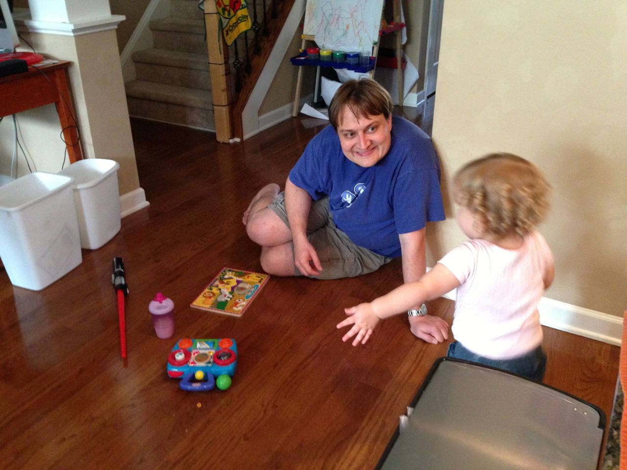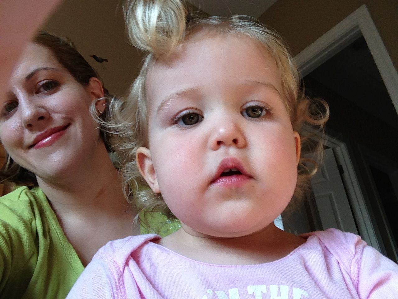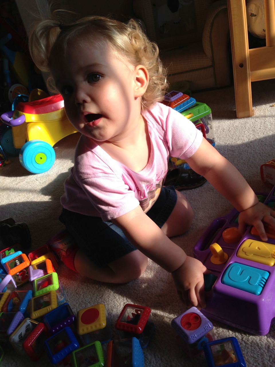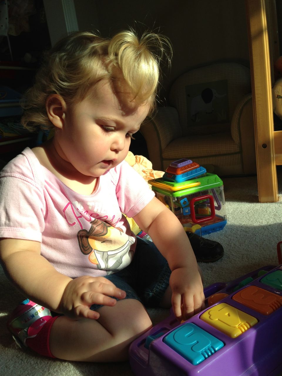 Kendall and I had some playtime this morning, while Brian was at speech! She was so cute in the morning sun. She danced to her radio, built with peek-a-blocks, played her piano, and made silly faces with lots of giggles when I turned on the phone’s front camera for her! Thanks to Grandma Sue, Kendall now has two of my granny’s Cabbage Patch dolls. These weren’t exactly for playing with when I was a kid, but I remember thinking how much I really wanted to play with that one in the yellow outfit with the curls and green eyes! I’m glad Kendall gets to enjoy the doll now–I’ve got a curly-haired baby girl of my own to dress up! (also: Brian wants to share his homework for his reading class, he drew this cool airplane. 🙂 )