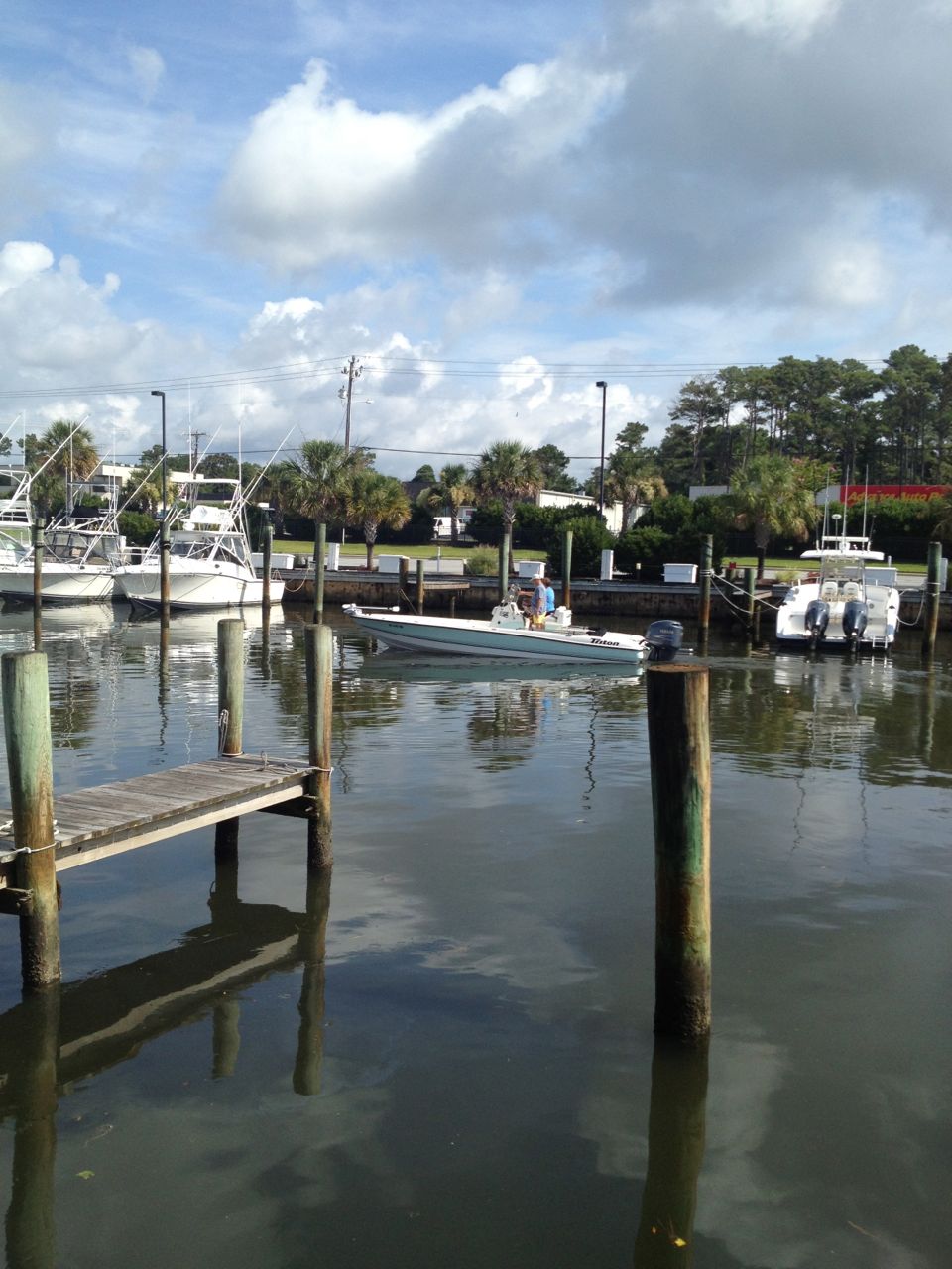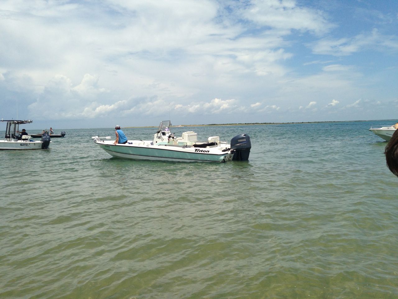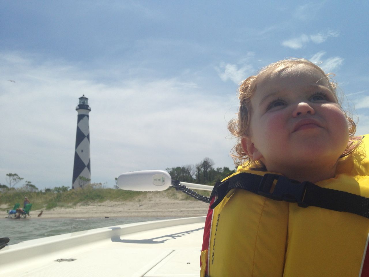 Upon arrival, we made a less-than-graceful boat exit while Steve dropped anchor (yay for bringing a Ziplock baggie to put my phone in!) We let the kids play on the beach for awhile, Kendall splashing and stomping, and Brian building a sand castle. Then we walked together to see the lighthouse and the visitor center. It was so incredibly hot! Thank goodness Grandma Sue had packed sandwiches and drinks–we destroyed every last crumb! The kids got to look at some shells and talked to a park staffer about them for awhile. We visited the gift shop, but alas, nobody had brought any money from the boat! D’oh. We wanted to get a particular book, but, we will add it to Brian’s wish list (ETA: it turns out that the book was by a local author and really hard to find! But Grandma Sue found it in a shop in Morehead and Brian received it for his birthday. Yay!! 🙂 ) We were all feeling overheated and a bit tired, so we decided to head back. Brandon and I took a super-quick tour of the lighthouse itself, while the kids got in a little more beach time with Grandpa and Grandma. We made our way back to the boat and we had an even-less-graceful time getting back in (okay, “we” being me, mostly! Grandpa and Grandma are pros at this and the kids were handled expertly.) The choppy water and high winds made the ride a little too exciting at top speed, so we had to slow it down some, and Brian seemed to think it took much longer to get back. 😉 But, he got to see some interesting ships and barges, and that made it fun.